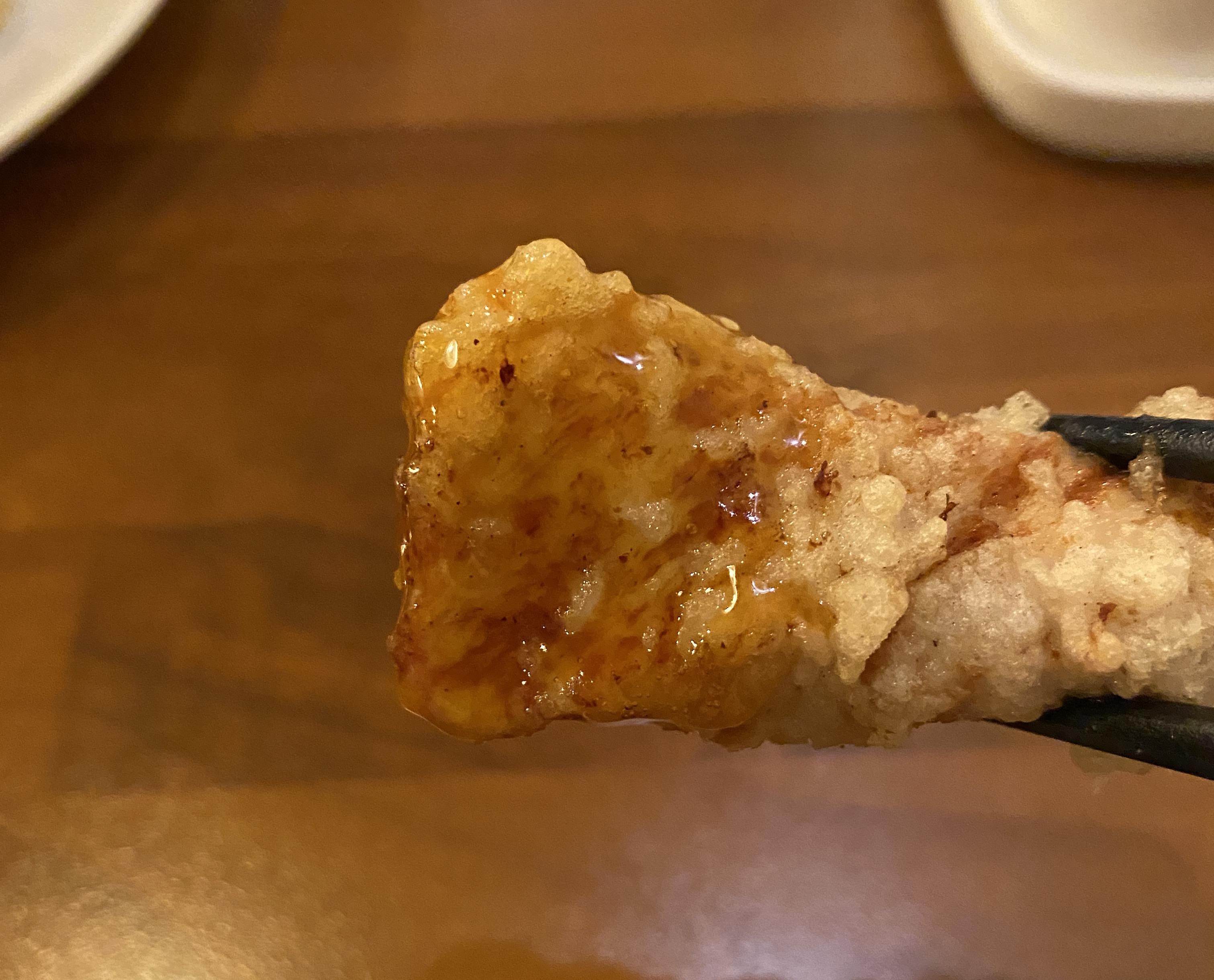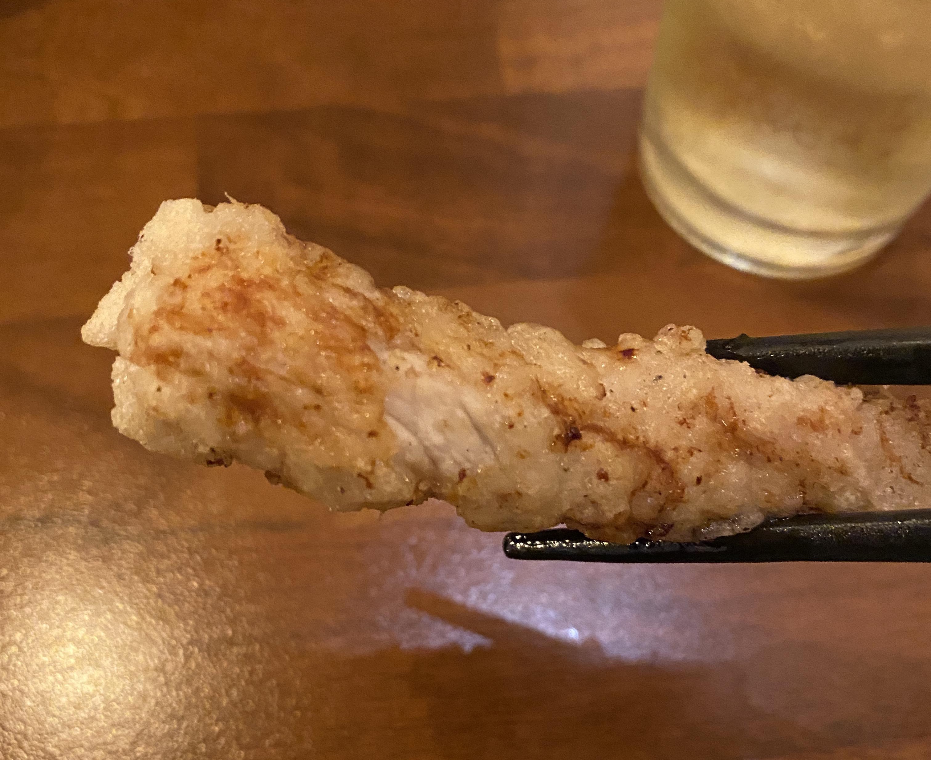 손가락보다 더 굵은 두께의 고기가 얇은 튀김옷을 입었는데